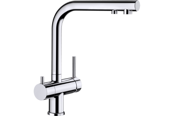 Praktisk 3-i-1 kjøkkenbatteri som gir kaldt, varmt og filtrert vann. Blandebatteriet har separate vannkanaler som sikrer at det filtrerte vannet ikke blandes med vanlig springvann. Egen hendel for filtrert vann på venstre side. Høy tut og full svingradius gir optimal brukervennlighet.