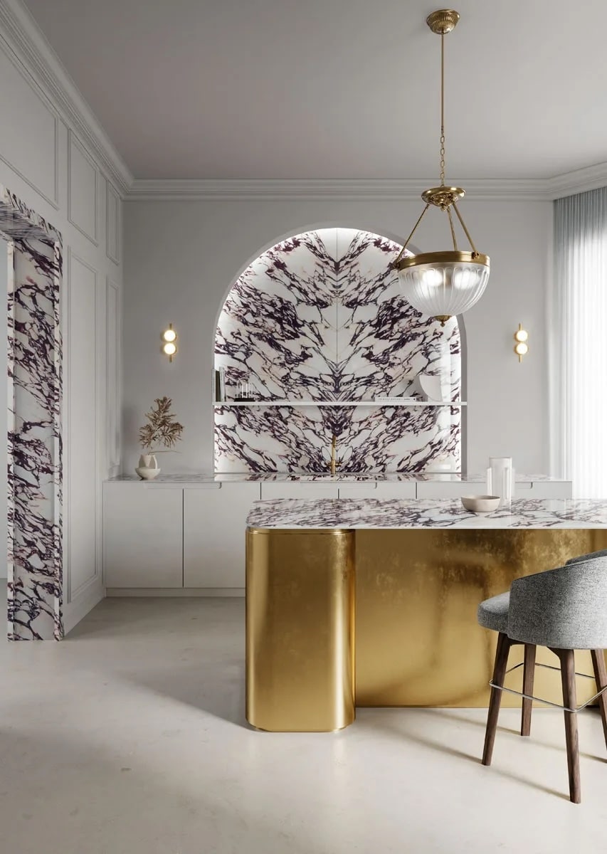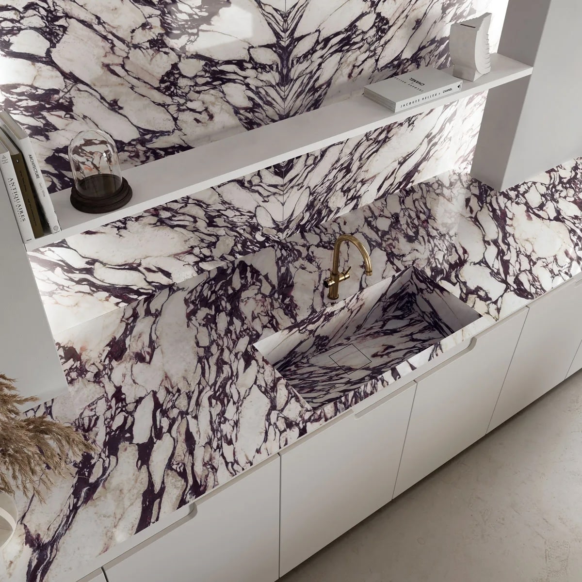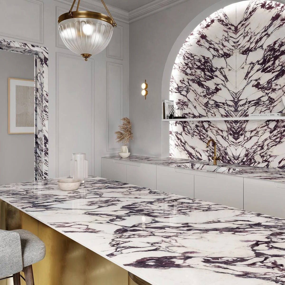 En luksuriøs keramisk benkeplate som på en perfekt måte gjenskaper det dristige og dramatiske uttrykket til naturmarmoren med samme navn. Den varmhvite grunntonen til Infinity Calacatta Viola brytes av intense fiolette årer og gylne nyanser, noe som skaper slående kontraster og gir interiøret særpreg.