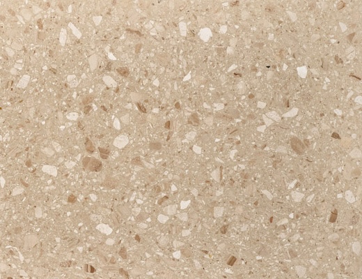 Olympo er en beigefarget terrazzo med et mønster satt sammen av steinfragmenter i ulike nyanser. Dette er et bærekraftig materiale fremstilt av knust overskuddsstein fra natursteinsproduksjon, tilsatt fargestoffer og et bindemiddel (harpiks).